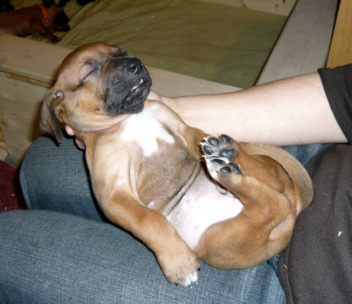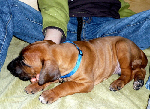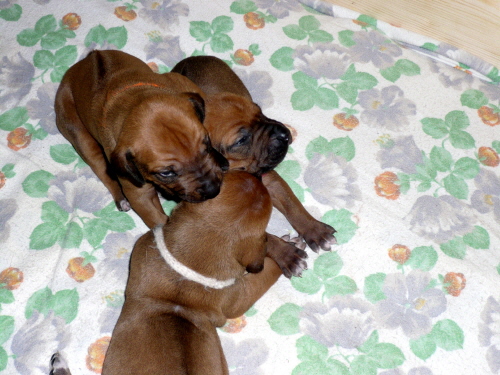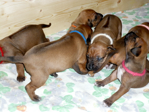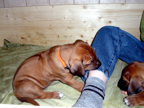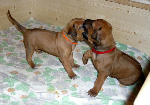 | Am Elften Tag haben die Welpen die Augen geöffnet und erkunden ihre Wurfkiste... | ... sich gegenseitig ... | |