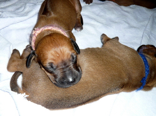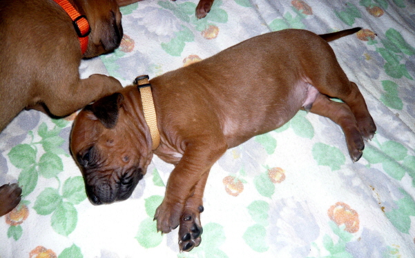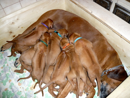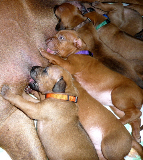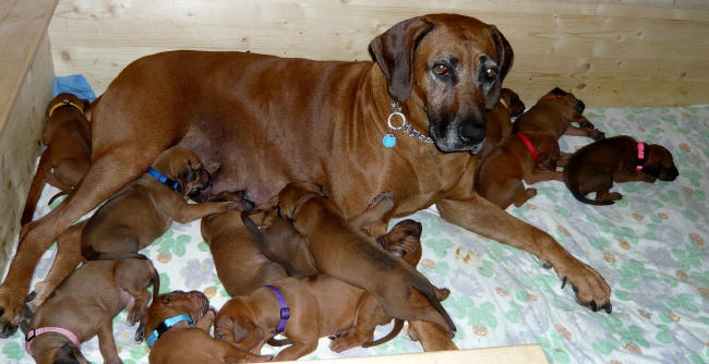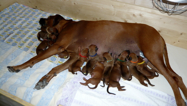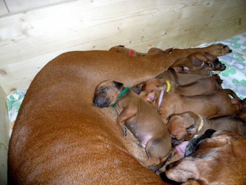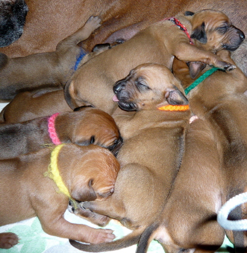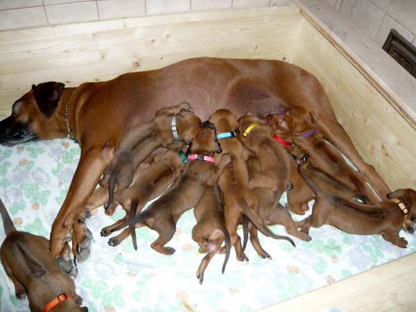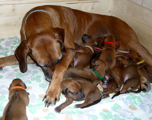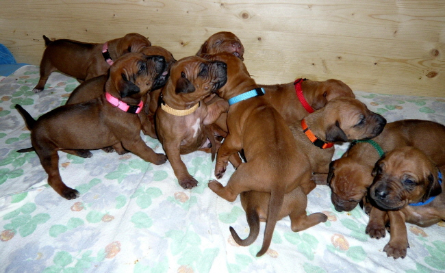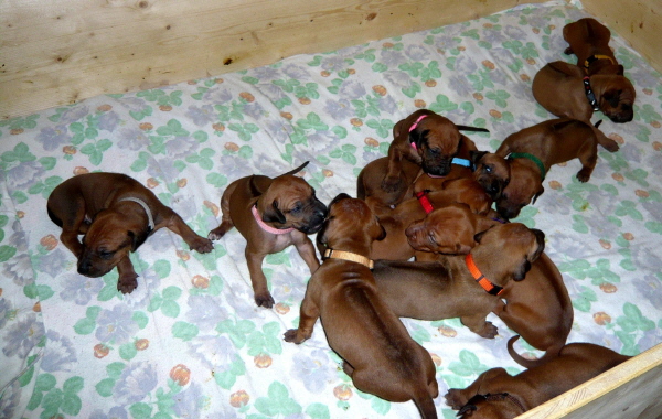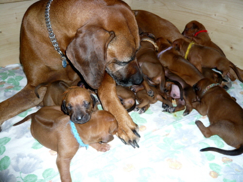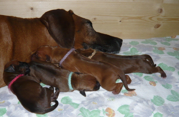 Zu unserer aller Überraschung sind 4 Welpen Livernose (Braunnasen) mit dunklem, intensiv rotem Fell und wunderschönen blauen Augen (die Augen werden sich später bernsteinfarben einfärben ) .Die seltenen Livernose Rhodesian Ridgeback's werden von Liebhaberkreisen als besonders leichtführige, sanfte und sozialverträgliche Hunde beschrieben, die sich sehr eng Ihren Menschen anschliessen .