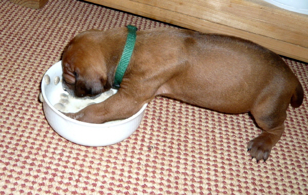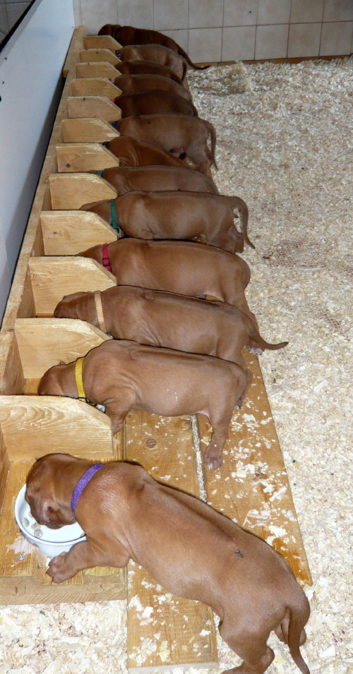 Die Welpen sind , wenn sie wach sind, eifrig am Spielen und erkunden das Welpenzimmer. Nun gibt es zusätzliche Nahrung aus Schüsselchen . Die Welpen entwickeln sich vorzüglich , wie man erkennen kann...